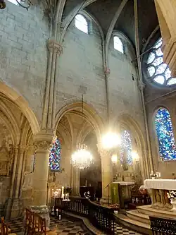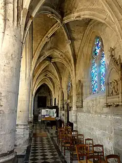 Bien que l'absence de nervures supplémentaires ne l'exige pas, la moitié des voûtes des bas-côtés de la nef possèdent initialement cinq clés de voûte. Les quatre clés secondaires sont plus petites et situées sur le tracé des ogives. De nombreuses clés ont été abîmées ou manquent totalement. Les motifs présentent une grande variété. On trouve des écus le plus souvent vierges de toute sculpture ; des découpages flamboyants peu complexes ; et le plus souvent des disques ornés de divers motifs en bas-relief. Certains se trouvent également dans la nef. L'on note des fleurs simples, des cristaux de glace, et des motifs plus rares dans la première et la quatrième travée du nord, ainsi que dans la quatrième travée du sud. Au nord, Pierre Gambier a identifié une gerbe de blé entre des outils agricoles, un poisson, un livre fermé, une gerbe entre des fleurs des champs et une grappe de raisin. Sur la clé centrale de la quatrième travée du sud, figurent les emblèmes de diverses métiers ou corporations sur la clé centrale : ciseaux, clou à ferrer les chevaux, enclume, rasoir, peigne de tisserand[28]. — Les bas-travées du chœur sont aussi bien conservées que le vaisseau central, ce que les remaniements visibles depuis l'extérieur ne permettent pas de soupçonner. Les piliers des grandes arcades et les supports au droit du chevet ont déjà été décrits. Les faisceaux de trois colonnettes qui reçoivent les doubleaux et ogives sont analogues. Contrairement aux supports du second ordre, la colonnette médiane est avancée, et s'appuie contre un dosseret. Puisque les voûtes sont plus petites que dans le vaisseau central, le maître d'œuvre a choisi un profil qui donne des ogives plus fines, à savoir un tore aplati en forme d'amande placé devant un bandeau.