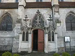 Au milieu du XIXe siècle, ne restent plus que quelques débris des XIIIe siècle et XVIe siècle dans la grande rosace, dont les motifs n'ont apparemment jamais évolué, mais dont les éléments ont été remplacés de fur et à mesure, si bien que l'ensemble actuel n'est plus qu'un pastiche de ce qu'il était du temps de saint Louis. À compter de 1873, l'église est équipée de nouvelles verrières, qui sont apparemment d'une facture assez banale selon les rares éléments qui en subsistent. Deux nouvelles fenêtres sont percées dans la chapelle de la Vierge et l'avant-dernière travée du bas-côté nord. La première verrière qui est installée représente saint Nicolas et sainte Adelaide, et est payée par M. Anchois. La seconde verrière a pour sujet saint Charles Borromée. La troisième, qui suit en 1874, figure sainte Félicité de Carthage, martyre, et est offerte par Mme Lensauffier. C'est également en cette année que la grande rosace du chevet retrouve son Christ pantocrator dans le médaillon central. Selon une décision du conseil de fabrique, des vitraux polychromes sont successivement installés dans toute l'église, dans la mesure que les finances le permettent[23]. Le portail occidental de la nef est refait en 1875, et le porche imaginé par Eugène Viollet-le-Duc[5] est ajouté devant le portail nord en 1885 (voir ci-dessus). Ces constructions de style néo-flamboyant sont discutables[21], et l'abbé Speybroeck qualifie même le porche d'« œuvre ignoble »[19].