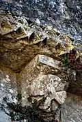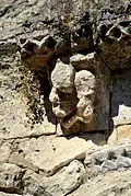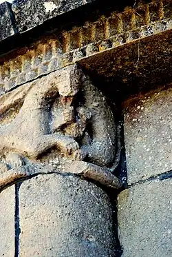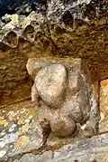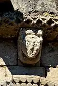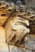 - 10 Un couple nu enlacé : Ce modillon est partiellement érodé, mais il existe des dizaines, quasi identiques, dans des églises romanes de la Gironde, la Charente et la Charente-Maritme et en Espagne, voir par exemple Iconographie des modillons romans - les couples. Du fait que l'érosion est différent pour chaque modillon on peut établir la composition originelle. Il s'agit d'un homme et une femme nus en traîne de copuler.