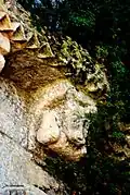- 3 Le seul modillon non-figuré porte un décor de feuilles et de lianes qui forment une pyramide, comme le classique 'point de diamant'.