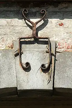 Le sommet de la façade est constitué, comme dit plus haut, d'un fronton triangulaire agrémenté d'un cartouche arborant le millésime « 1760 »[3].