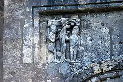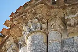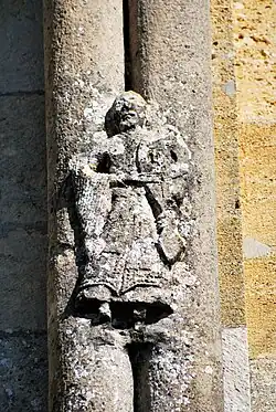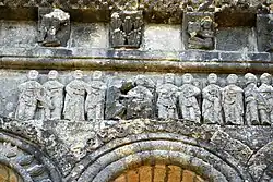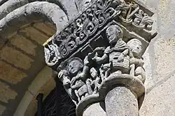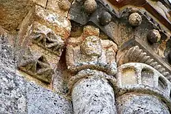 - un bandeau sert d'appui à trois arcades portées par des colonnes sculptées avec la sculpture en relief d'un musicien étrangement plaqué à mi-hauteur sur deux colonnes géminées.