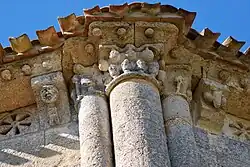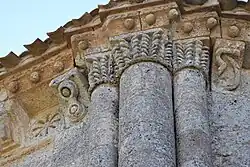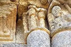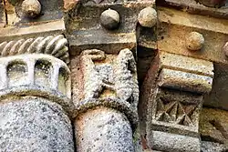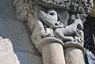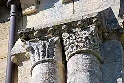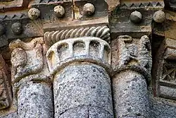 La corniche commune aux trois chapiteaux et le tailloir torsadé du chapiteau central ne sont pas d'origine, ils ont été refaits au XIXe siècle.