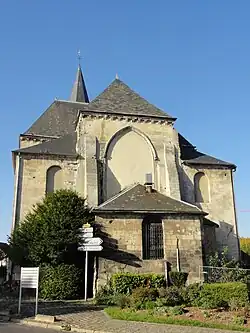 Vers l'ouest, les croisillons possèdent des fenêtres analogues à celles de la nef. Les murs d'extrémité nord et sud montrent les contours d'anciens pignons. En haut, ils se retraitent grâce à un fruit. Les chaînages, les pourtours des fenêtres en anse de panier et les parties hautes sont en pierre de taille. Sinon, les murs sont constitués de moellons irréguliers noyés dans un mortier. Les fenêtres ont été repercées à la fin du XVIIe siècle. Il n'y a pas, ou plus, de contreforts, pas plus que sur les deux chapelles latérales. Elles sont bâties en pierre de taille, et présentent latéralement une fenêtre en anse de panier. Les fenêtres du chevet, aujourd'hui bouchées, sont néanmoins en plein cintre : ce manque de consistance pour des constructions apparemment homogènes est surprenant. Le chevet de l'abside du chœur est plus intéressant. Les deux contreforts orthogonaux qui épaulent chaque angle ont permis à Dominique Vermand de dater l'ensemble de l'église de la même époque, à savoir le troisième quart du XIIIe siècle. En effet, ces contreforts sont encore presque plats. Ils se retraitent deux fois par des glacis fortement inclinés, sans larmiers, et s'amortissent par un glacis analogue. La corniche est la même que sur la nef et les bas-côtés. Une baie de grandes dimensions a apparemment été percée dans le chevet à la période flamboyante, comme l'indiquent les deux chimères sur lesquelles retombe l'archivolte prismatique. Plus aucune fenêtre ne subsiste sur l'élévation orientale[7].