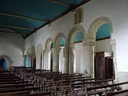 La nef romane (XIe siècle) de huit travées[6], couverte de charpente, s'ouvre sur les bas-côté par des arcs de plein cintre à simple, puis double rouleau dans la partie est[7] (pour deux arcs au nord et trois au sud, ce qui peut laisser envisager deux campagnes de construction). Sous une imposte simple, ils retombent sur des supports à chapiteaux alternant piles rondes et piles composées[8], toutes différentes : colonne, pilier carré ou cruciforme avec colonnettes engagées seules ou par paires. La majorité des chapiteaux sont sculptés. La base des piles disparait sous le dallage, le sol ayant été rehaussé. Les arcades occupent les deux tiers de la hauteur du mur, surmontées de fenêtres hautes très ébrasées (aujourd'hui bouchées) dont la répartition semble aléatoire.