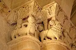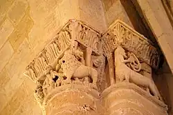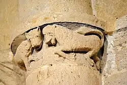 Les quatre lions : Le lion est, de très loin, la représentation animale la plus fréquente dans l'iconographie romane. Sur les chapiteaux, ils participent à des mises en scène complexes, à caractère symbolique et souvent moralisateur.