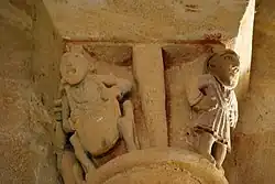 L'image d'un homme à cheval est très rare en Gironde. L'exemplaire, ici, est le seul modillon avec un cavalier ; un chapiteau de l'église Sainte-Eulalie de Lignan en porte un.