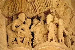 Les sculptures figurées du cordon sont toutes des rappels de moralité. Seule, la dernière est romane, les autres, de moins bonne facture, datent d'une refonte ornementale faite environ vers l'an 1200.