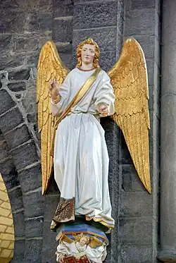 Le , furent installées deux statues composant le groupe dit de l'Annonciation, soit la Vierge et l'archange Gabriel. Ces sculptures sont attribuées au sculpteur tournaisien Jean Delemer (en). Ces deux sculptures sont en pierre blanche d'Avesnes, mesurent environ 1,80 m de haut et furent réalisées en 1428.