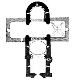 - la nef de trois travées à peu près carrées dont les deux extrêmes sont voûtées en berceau plein cintre, tandis que celle du milieu est recouverte par une coupole sur pendentifs. La porte ouverte dans la façade occidentale possède une décoration curieuse.
