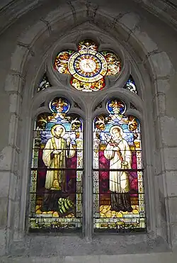 - Le quatrième représente saint François Xavier à gauche et saint Louis de Gonzague à droite. Tous les deux étaient membres de la Compagnie de Jésus (les jésuites). Au-dessus de ces deux saints, le vitrail est composé d’un soufflet en forme de trèfle à quatre feuilles dans lequel on remarque trois cercles concentriques. Dans le cercle extérieur, on lit la devise des jésuites : « Ad maiorem Dei gloriam » (« pour la plus grande gloire de Dieu »)[APPA 8],[APPA 7].