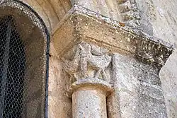 Sur le chapiteau sud, deux canards sont en train de déchiqueter un reptile (un fac-similé réalisé au XIXe siècle) et sur le chapiteau nord, deux oiseaux s'abreuvent à un même calice.