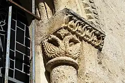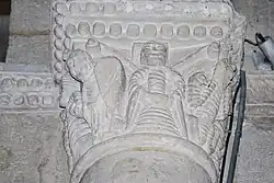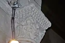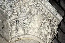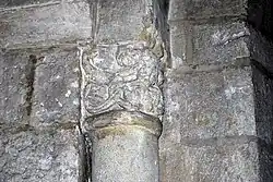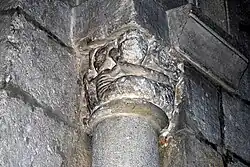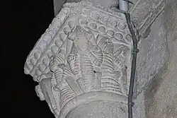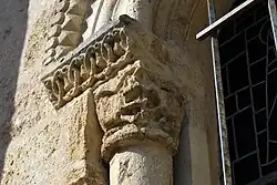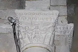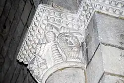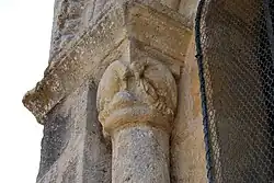 Sur le chapiteau ouest, se trouve un fauve bi-corporé (deux fauves réunis par une tête unique) et, sur le chapiteau est, deux oiseaux huppés qui détournent leurs têtes pour lisser du bec leurs plumes.
