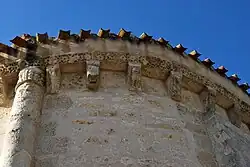 Le décor sculpté est concentré dans l'abside. La corniche porte des modillons et une ornementation de cercles et étoiles ; les fenêtres sont ornées de chapiteaux et, à l'intérieur, se trouvent des chapiteaux sculptés.