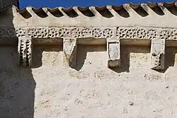 Une longue série de modillons supporte la corniche dont le chanfrein est orné de cercles étoilés.