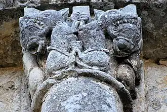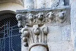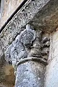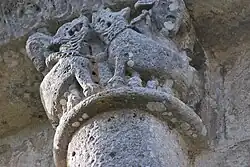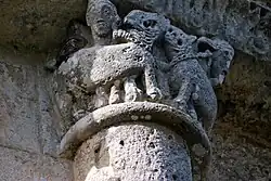 Six chapiteaux romans, dont deux sont historiés, soutiennent la corniche. Du sud au nord : feuillage d'acanthes, lions et dompteurs, acanthes, les quatre dogues, pignes, acanthes.