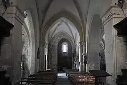 Deux travées de l'église voûtées d'ogives ont été construites au XIIIe siècle. Au XVe siècle ont été ajoutées une troisième à l'est, trois chapelles au nord et deux au sud.