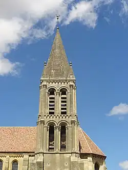 Le clocher roman bâti vers 1130-1140 comporte deux étages de baies et une flèche octogonale en pierre, cantonnée de quatre pyramidons sur plan carré qui assurent la transition du plan carré au plan octogonal. La base, dont l'intérieur a déjà été décrit, est épaulé par deux contreforts carrés par angle. En haut du rez-de-chaussée, les contreforts se retraitent par des glacis, et deviennent plats pour les derniers décimètres. Ils sont également visible aux angles nord-ouest et nord-est, ce qui a suscité l'hypothèse qu'il était conçu pour rester hors œuvre. Pourtant les contreforts ne s'aperçoivent pas de l'intérieur de l'église. Comme d'accoutumée, la base est d'une facture assez sobre, ce qui crée un contraste avec les étages qui bénéficient d'une riche ornementation. La baie en plein cintre côté sud est toutefois pourvue d'une archivolte torique surmonté d'un cordon de têtes de clou retombant sur de petites têtes grimaçantes, et elle s'ouvre entre deux colonnettes à chapiteaux, dont les hauts tailloirs sont trois fois plus larges que nécessaire. Afin de faire paraître la fenêtre plus grande qu'elle ne l'est, les colonnettes et l'archivolte prennent du recul par rapport à l'ouverture. Le rez-de-chaussée se termine par un bandeau mouluré, qui le sépare du premier étage. Ce bandeau incorpore les contreforts qui sont plats à ce niveau, avant de se transformer en bases pour les contreforts-colonnes du premier étage. En haut de cet étage, les colonnes se transforment de niveau en contreforts plats et se fondent dans la corniche beauvaisine, qui ici ne comporte pas d'arcatures. Cette solution de raccorder les contreforts à la corniche a été saluée par plusieurs auteurs. Une corniche beauvaisine se compose de petites arcatures plein cintre, qui retombent sur des corbeaux sculptés en masques, et qui sont subdivisées chacune dans deux arcatures plus petites. Ce type de corniche est répandu dans le Beauvaisis, dans le Vexin français et dans la moyenne vallée de l'Oise entre 1120 et 1200 environ. Une arcature de corniche a été disposé entre le contrefort et l'angle de la tour, et un mascaron occupe exactement l'angle. Ici l'architecte a également fait preuve d'adresse. Sauf en haut de l'étage, les angles du clocher sont par ailleurs agrémentés de fines colonnettes appareillées. Contreforts-colonnes, corniche beauvaisine et colonnettes d'angle se retrouvent de façon identique au niveau du second étage, qui ne se distingue guère que par son diamètre légèrement réduit (huit au lieu de neuves arcatures de corniche trouvent leur place entre les colonnes), et par certains motifs des chapiteaux[6],[25],[26].
