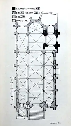 Orientée un peu irrégulièrement vers le sud-ouest du côté de la façade occidentale, l'église se compose d'une nef de quatre travées barlongues accompagnée de collatéraux ; d'un chœur de deux travées, comportant une travée carrée et une abside à pans coupés ; de deux collatéraux du chœur bordant sa première travée ; et de deux chapelles au chevet plat flanquant l'abside. La longueur totale est de 28,70 m, dont 18,40 m incombent à la nef et 10,30 m. La largeur totale est de 12,80 m au niveau de la nef, qui elle-même est large de 6,00 m, voire seulement 5,25 m d'une colonne à l'autre. La hauteur sous les voûtes atteint les 12,15 m[14]. Un annexe ayant probablement servi de prison précède à l'ouest le bas-côté nord, et une sacristie occupe l'angle entre la chapelle latérale sud et l'abside. Ce sont les seules parties de l'église antérieures à 1210.