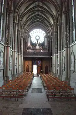Dans le bras gauche du transept, on remarque une Vierge à l'Enfant nommée Regina pacis (« Reine de la paix ») près de laquelle a été fixée une plaque rappelant que c'est à deux cent cinquante mètres de cet édifice – dans une salle du Collège technique et moderne de Reims, l'actuel lycée Roosevelt – que, le , vers 2 h 40, fut signé par le général Alfred Jodl l'acte mettant fin à la Seconde Guerre mondiale en Europe.