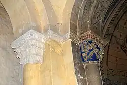 Les corbeilles des piliers de la coupole de la croisée sont de grand format. Une suite de volutes tapisse les tailloirs ; certains angles portent un masque animalier ou humain. Tous les chapiteaux seraient encore en parfait état si l'on n'avait pas martelé 8 des 18 têtes.