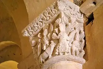 Le chapiteau ouest du pilier possède une corbeille ornée de simples feuilles d'acanthe. Le chapiteau à l'entrée du presbytérium est plutôt énigmatique. Léo Drouyn[3] a proposé l’interprétation suivante, tirée du Premier livre des Rois (chapitre XIX, versets 3-9) : « le prophète Élie endormi sous le genièvre et nourri par l'ange avec galette chaude et cruche d'eau », dont le récit biblique a le mérite de correspondre, en grande partie, aux personnages de la sculpture.