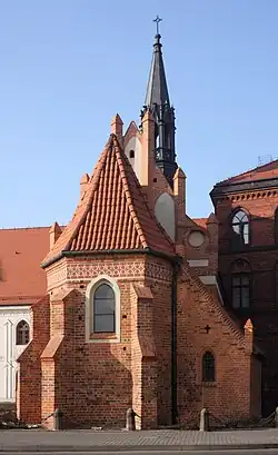 L'église a été construite dans le style gothique, en briques brûlées. C'est le bâtiment d'une seule nef, avec le presbytère rectangulaire séparé, fermé de façon polygonale, s'inclinant de l'axe vers la gauche, ce qui ressemble à la position de Jésus mourant sur la croix. À l'intérieur se trouve la voûte sur croisée d'ogives