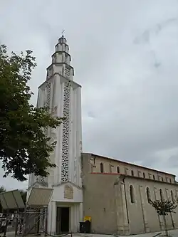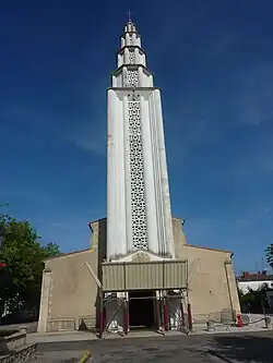 Le clocher en béton, qui rappelle les constructions dues à Auguste Perret, est de plan carré et surmonté de quatre niveaux polygonaux formant une flèche. Il est cantonné de colonnes et les parois ornées de claustras percées de baies avec jours à motifs circulaires et d'une hauteur de 38 m. La porte occidentale est couronnée d'un fronton triangulaire, orné d'un bas-relief. Deux autres portes également ornées de bas-reliefs sont percées sur les façades latérales du porche. Les bas-reliefs sont l’œuvre du sculpteur bordelais Joseph Rivière.