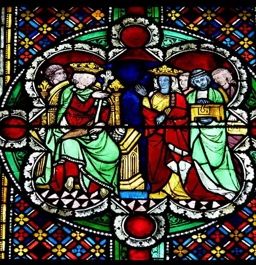 - Ces indications suggèrent une autre interprétation : la rencontre de la reine de Saba avec le roi Salomon, dont le récit se trouve dans l'Ancien Testament : Premier Livre des Rois, chapitre 10, versets 1-13[6]. Ce thème était très populaire avec les peintres de la Renaissance italienne, mais très rare en sculpture romane (aucun autre exemple en Gironde). Il existe un vitrail de la cathédrale de Cologne, vers 1280, qui illustre cette rencontre.