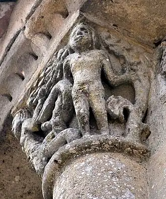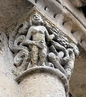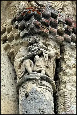 - Le chapiteau central de la baie géminée est figuré : Un homme nu, sur l'angle ouest, touche, avec chaque main, la croupe d'un lion, dont la queue est d'abord rentrante, puis remontante, pour terminée fleurdelisée.