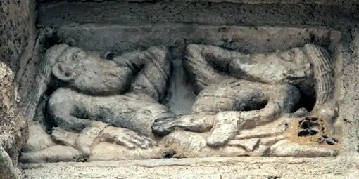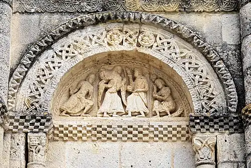 - Le tympan est sculpté d'un bas-relief remarquable. On voit quatre personnages : à gauche, un homme en génuflexion derrière une femme vêtue d'une robe longue, richement brodée, aux manches larges et évasées. En face d'elle se trouve un homme, également richement habillé. Il tient dans la main gauche un objet sphérique. Derrière lui un personnage assis, dans une attitude de profonde réflexion.