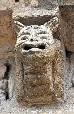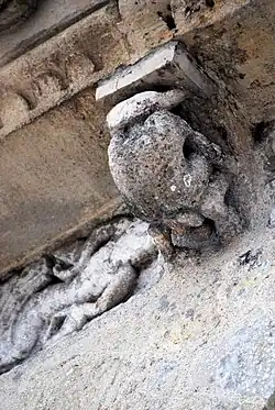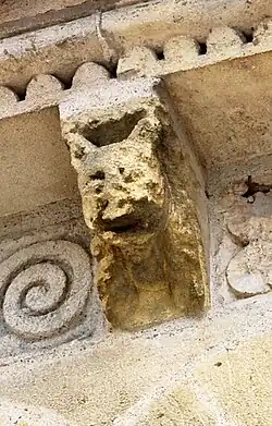- La corniche est supportée par trois modillons, dont un figuré : une double « fleur de lys » ; un homme nu qui porte deux pignes de pin et un entrelacs. Les deux premiers modillons semblent dater de la reconstruction de 1880.