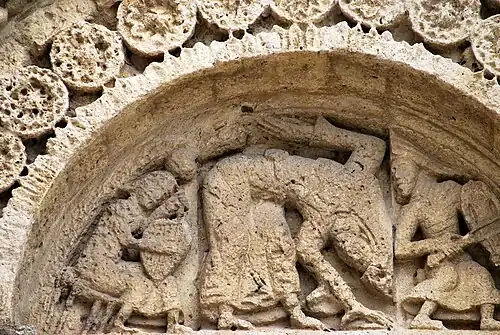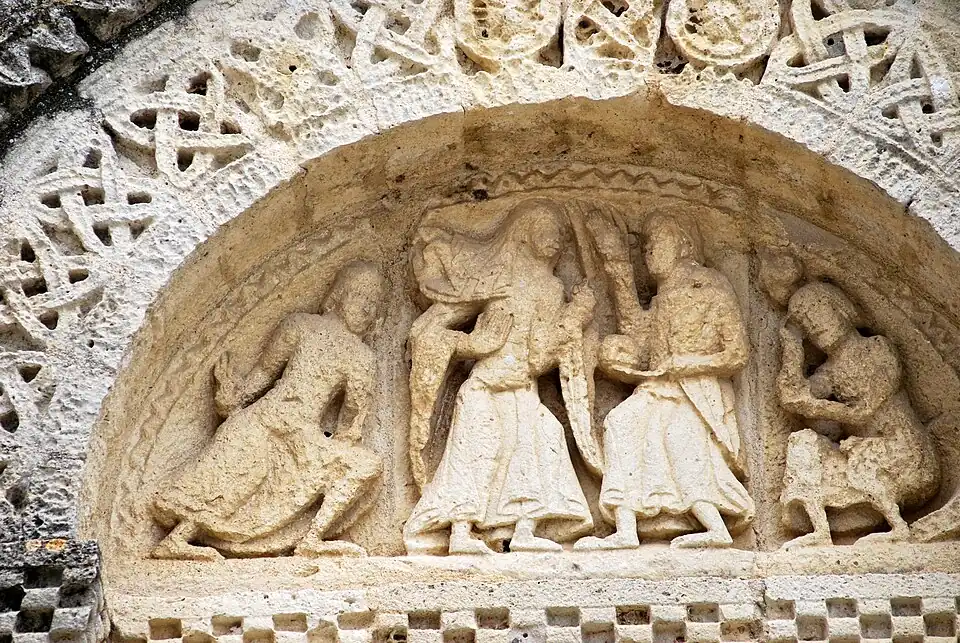 - Le tympan est un bas-relief remarquable. On voit trois personnages : à gauche un homme assis qui joue du psaltérion ; au centre une femme, habillée en robe longue. Elle est courbée devant, sa main gauche touche le sol, son bras droit est tenu en l'air ; à droite un autre homme joue de la vièle.