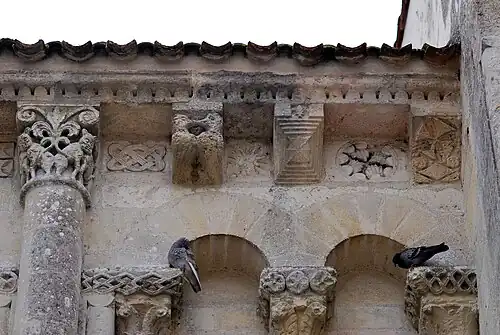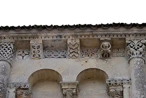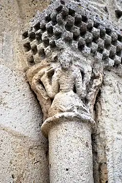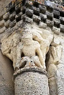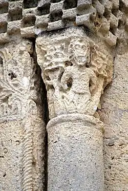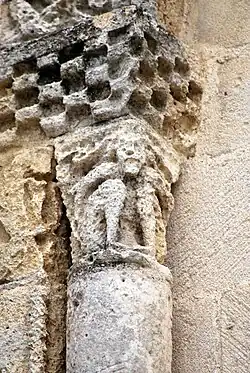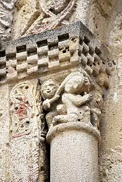 - La corniche est supportée par trois modillons : un homme à genou, les bras écartés ; un entrelacs et un modillon récent (1880 ?) d'une tête humaine. Entre les modillons se trouvent trois métopes : un entrelacs ; une femme exhibitionniste génitale et un rinceau. La corbeille du chapiteau séparatif porte un entrelacs.