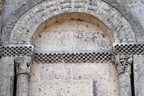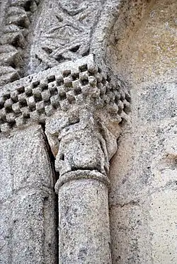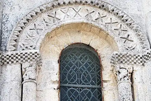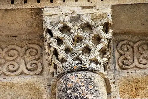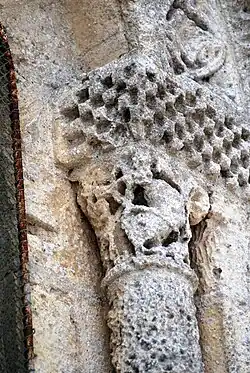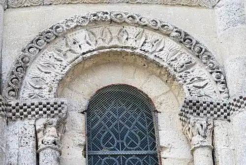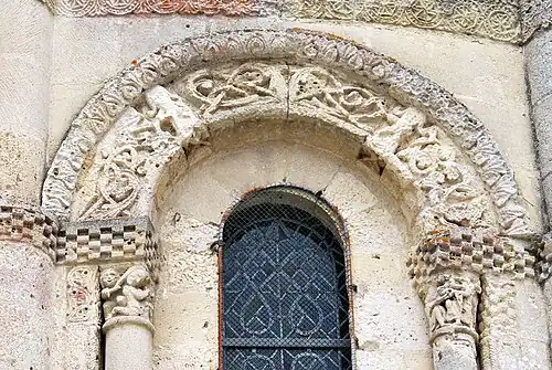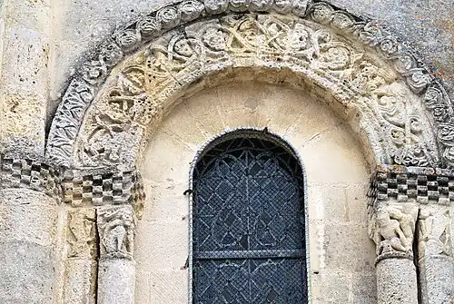 - L'archivolte et la voussure de la baie sont très érodés, mais on distingue que la décoration est de simple entrelacs à rinceaux.