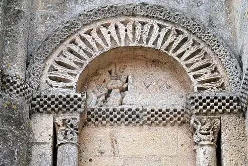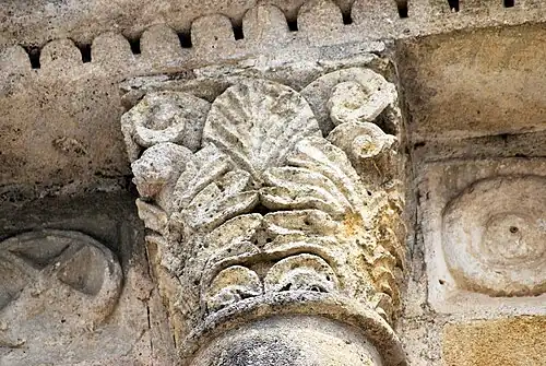 - Les deux chapiteaux qui supportent l'arc sont également érodés. Sur l'angle de la corbeille du chapiteau au sud on voit les traces d'une personnage accroupi. Il est difficile d'en dire plus. Le chapiteau au nord est trop abîmé.