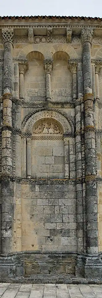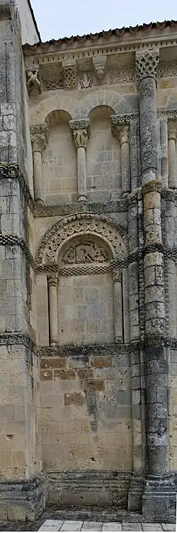 - L'ensemble est couronné par une corniche moulurée à modillons alternant avec des métopes sculptés. Au total il y 27 modillons sculptés, dont 13 figurés ; 34 métopes sculptés, dont 5 figurés et 8 chapiteaux sculptés, dont un historié.