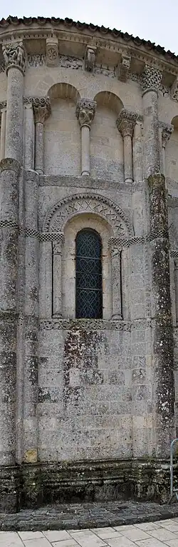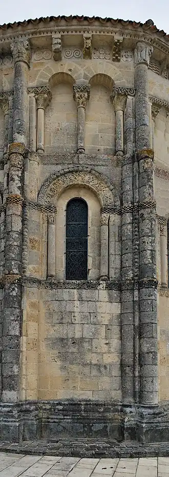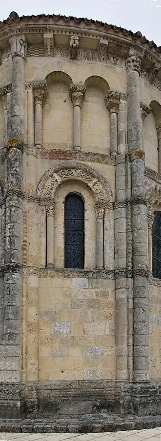 Le chevet est composé de deux travées aveugles, formant le chœur, et de cinq baies en plein-cintre encadrées de colonnes à chapiteaux sculptés et séparées par d'autres colonnes supportant des rouleaux d'archivoltes traités en tores. Un bandeau sculpté de motifs de fleurs inscrites dans des cercles court en continu sous les baies.