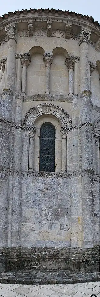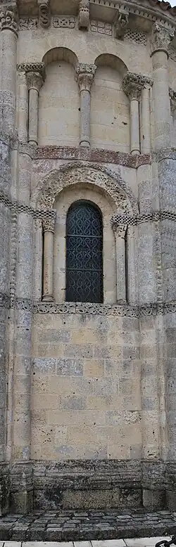 - Le registre médian est composé d'arcades et de baies en plein-cintre avec voussure et rouleau d'archivolte sculptés et colonnettes à chapiteaux. Dans les pans 1 et 2, au sud et pans 8 et 9 au nord, trois des quatre tympans sont ornés de bas-reliefs.