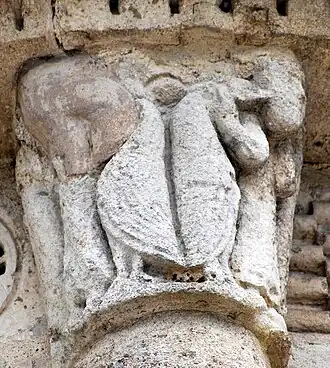 - Il y a deux types sur le thème d'animaux superposés : les animaux forment des strates indépendantes, comme sur des poteries grecques ou des bas-reliefs égyptiens ; il y a interaction entre les animaux superposés (les oiseaux d'un niveau picorent les têtes d'un animal sur un autre niveau comme ici). Ce type de superposition est très abondant dans la sculpture romane du sud-ouest de la France. Il s'agit d'une véritable iconographie de caractère symbolique, dont la signification des détails nous échappe aujourd'hui[7].