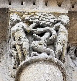 - Le chapiteau de séparation est historié et représente la chute d'Adam et Ève.