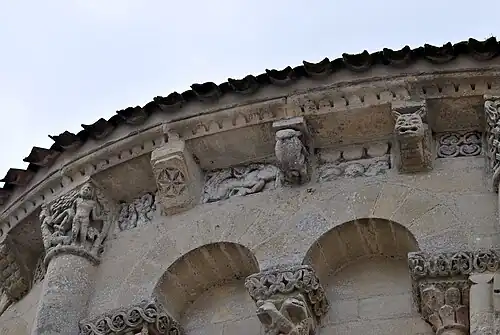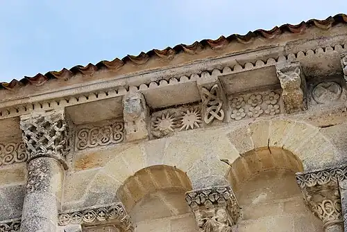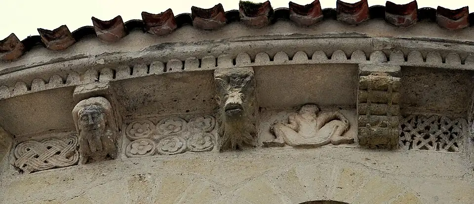 - La corniche est supportée par trois modillons, dont deux sont figurés : un homme avec une barbe taillée en carré (il semble qu'à origine l'homme était ithyphallique, mais le modillon a été martelé à une époque assez récente) ; une bête maléfique avec une grande crinière ; le troisième modillon représente cinq bâtons liés par des cordes. Les quatre métopes sont toutes sculptées avec des bas-reliefs : un entrelacs classique ; six fleurs de marguerite ; un personnage habillé en tunique longue, les jambes écartées et un entrelacs fait avec des rinceaux. La troisième métope semble dater de la reconstruction de 1880, car le personnage est habillé, ce qui ne correspond pas à l'iconographie romane pour ce type de représentation.