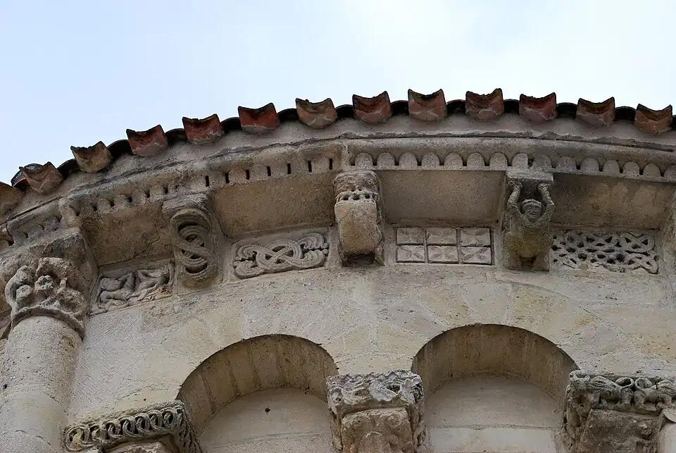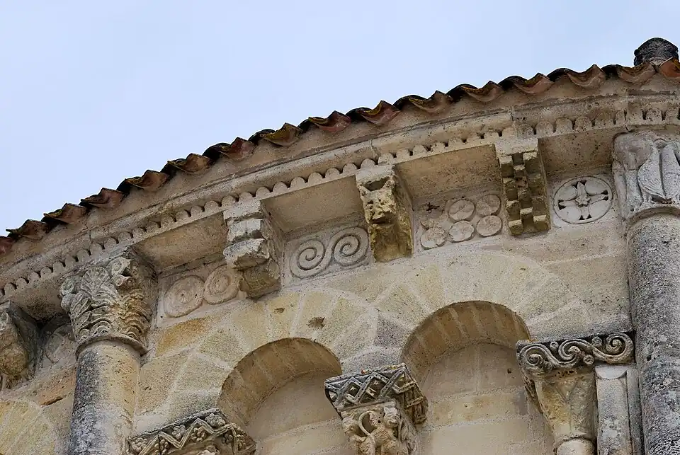 Des frises sculptées à motifs de billettes, de rinceaux et de fleurs à six pétales inscrites dans un cercle, règnent sur l'ensemble du chevet.