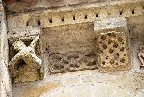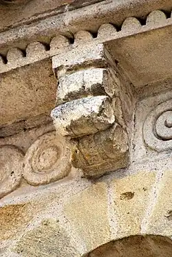 - La corniche est supportée par trois modillons : deux félins séparés par un entrelacs. Entre les modillons quatre métopes sculptées : un double rinceau ; deux soleils ; six fleurs à cinq pétales et un X inscrit dans un cercle.