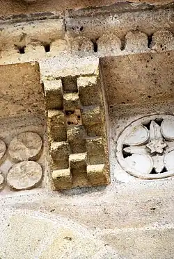 - L'archivolte de la baie aveugle est en dents de scie et les claveaux de la voussure portent une simple croix.