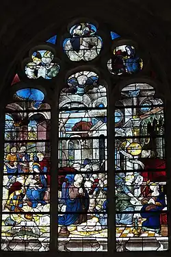 Dans d'autres baies se sont seulement conservés quelques fragments. Sur le fragment d'un vitrail classé monument historique à titre objet en 1944[4] on reconnaît la Présentation au Temple.