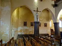 La structure du chœur est rapidement décrite. Tous les autres piliers sont dépourvus de tailloirs et de chapiteaux. Le mur du chevet ne conserve que le tympan de sa fenêtre en plein cintre, le reste étant bouchée en raison de la présence du grand retable du maître-autel. L'arc-doubleau qui sépare les deux voûtes est analogue à l'arc triomphal. Les deux travées sont nettement barlongues, et les arcades latérales sont donc plus étroites. Elles ne sont pour autant pas beaucoup plus aigües, comme le veut généralement la logique à la période gothique, et il y a de ce fait une portion de murs nus au-dessus de ces arcades. Dans tous les cas, les arcades ne coïncident pas avec les arcs d'inscription des voûtes, qui sont situées plus haut. Les voûtes, en arc brisé, sont des plus rustiques, sans arcs formerets, ni colonnettes à chapiteaux, ni clés de voûte sculptées. Les ogives affectent un profil de section carrée. Comme seule concession à l'esthétique de l'époque de construction, soit le milieu ou le troisième quart du XVIe siècle, les arêtes sont adoucies par une doucine. Ce profil des ogives n'apparaît pas dans les autres églises Renaissance du voisinage.