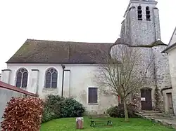 La partie haute du clocher, qui représente environ la moitié de sa hauteur, est épaulé par deux contreforts plats à chacun de ses angles. Du côté est, ils sont toutefois plus saillants, et se retraitent une fois par un glacis. Peu avant la corniche de l'étage de beffroi, ils s'amortissent par un glacis couvert de tuiles. L'étage de beffroi, purement fonctionnel, est percé de deux étroites baies abat-son en plein cintre sur chacune de ses faces. Les murs se terminent par une corniche composée de plusieurs strates de modénature, probablement réalisé en stuc. Elle ne devrait pas être antérieure au XVIIe siècle, époque proposée comme date limite de construction par Charles Huet[6]. En somme, le clocher de Puiseux est sans intérêt architectural réel, à l'instar de ses voisins de Jagny-sous-Bois, Lassy, Roissy-en-France, Villaines-sous-Bois, etc. Sur la façade occidentale, l'on note seulement que le contrefort de droite du clocher descend plus bas que le glacis qui sépare les deux parties de la tour, sans faire saillie devant la partie basse, jusqu'à se fondre dans l'avant-corps que forme le mur occidental de la nef. Cet avant-corps est également protégé par quelques rangs de tuiles. Le pignon de la nef, ainsi que le mur occidental du bas-côté sud et son demi-pignon, sont ainsi placés en léger retrait. Cette disposition donne à penser que ces parties en retrait soient plus récentes que le reste. L'avant-corps est épaulé par un contrefort sans style à droite seulement. Le bas-côté sud présente un contrefort analogue du côté ouest. Comme fenêtres, il n'y a qu'une petite baie rectangulaire dans le pignon de la nef, et à son aplomb, la baie en plein cintre qui assure seule l'éclairage de la nef. Les deux sont désaxées vers la gauche par rapport au sommet du pignon. Pour revenir vers l'élévation septentrionale, celle du portail, elle présente une corniche en stuc, des contreforts sans style, la petite baie rectangulaire et grillagée de la sacristie, et les deux seules baies à remplage de l'église.