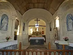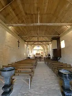 L'intérieur est assez sobre. Il est composé d’une nef unique (partie de l’église située entre la façade et le chœur, destinée à recevoir les fidèles laïcs c'est-à-dire les chrétiens n’appartenant pas au clergé). Cette nef ornée dans le goût classique ne possède pas de transept (vaisseau transversal qui forme une croix avec la nef). La charpente est assez rustique avec une voûte en lambris en bois du XVIème rénovée en 2007. Les murs sont blanchis à la chaux.