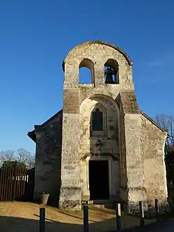 La façade romane de cette église est soutenue par deux puissants contreforts, disposés de part et d’autre du portail. Elle est surmontée d'un clocher ou campanile (tour qui abrite des cloches) arrondi à double bretèche (ouvertures). Ce dernier est ainsi percé de deux baies en plein cintre destinées à accueillir des cloches, d'où le nom de clocher-mur, clocher-peigne ou clocher-arcade (assez rare en Anjou)[2],[4].